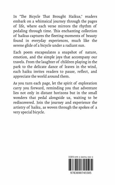 In "The Bicycle That Brought Haikus," readers embark on a whimsical journey through the pages of life, where each verse mirrors the rhythm of pedaling through time. This enchanting collection of haikus captures the fleeting moments of beauty found in everyday experiences, much like the serene glide of a bicycle under a radiant sun. Each poem encapsulates a snapshot of nature, emotion, and the simple joys that accompany our travels. From the laughter of children playing in the park to the delicate dance of leaves in the wind, each haiku invites readers to pause, reflect, and appreciate the world around them. As you turn each page, let the spirit of exploration carry you forward, reminding you that adventure lies not only in distant horizons but in the small wonders that pedal alongside us, waiting to be rediscovered. Join the journey and experience the artistry of haiku, as woven through the spokes of a very special bicycle.