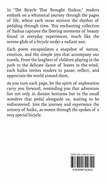 In "The Bicycle That Brought Haikus," readers embark on a whimsical journey through the pages of life, where each verse mirrors the rhythm of pedaling through time. This enchanting collection of haikus captures the fleeting moments of beauty found in everyday experiences, much like the serene glide of a bicycle under a radiant sun. Each poem encapsulates a snapshot of nature, emotion, and the simple joys that accompany our travels. From the laughter of children playing in the park to the delicate dance of leaves in the wind, each haiku invites readers to pause, reflect, and appreciate the world around them. As you turn each page, let the spirit of exploration carry you forward, reminding you that adventure lies not only in distant horizons but in the small wonders that pedal alongside us, waiting to be rediscovered. Join the journey and experience the artistry of haiku, as woven through the spokes of a very special bicycle.