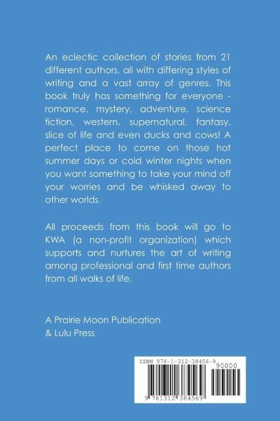 An eclectic collection of stories from 21 different authors, all with differing styles of writing and a vast array of genres. This book truly has something for everyone - romance, mystery, adventure, science fiction, western, supernatural, fantasy, slice of life and even ducks and cows! A perfect place to come on those hot summer days or cold winter nights when you want something to take your mind off your worries and be whisked away to other worlds.