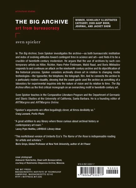 The typewriter, the card index, and the filing cabinet: these are technologies and modalities of the archive. To the bureaucrat, archives contain little more than garbage, paperwork no longer needed; to the historian, on the other hand, the archive's content stands as a quasi-objective correlative of the living past. Twentieth-century art made use of the archive in a variety of ways from what Spieker calls Marcel Duchamp's anemic archive of readymades and El Lissitzky's Demonstration Rooms to the compilations of photographs made by such postwar artists as Susan Hiller and Gerhard Richter. In The Big Archive, Sven Spieker investigates the archive as both bureaucratic institution and index of evolving attitudes toward contingent time in science and art and finds it to be a crucible of twentieth-century modernism.