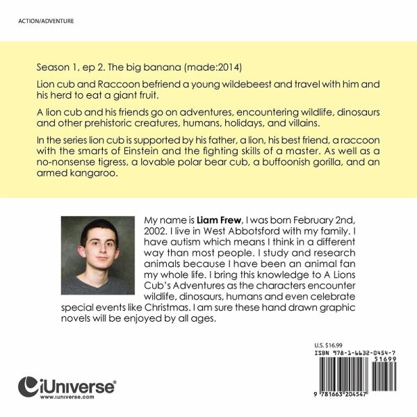 Season 1, ep 2. The big banana (made:2014) Lion cub and Raccoon befriend a young wildebeest and travel with him and his herd to eat a giant fruit. A lion cub and his friends go on adventures, encountering wildlife, dinosaurs and other prehistoric creatures, humans, holidays, and villains. In the series lion cub is supported by his father, a lion, his best friend, a raccoon with the smarts of Einstein and the fighting skills of a master. As well as a no-nonsense tigress, a lovable polar bear cub, a buffoonish gorilla, and an armed kangaroo.