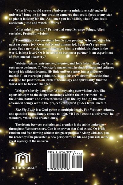 What if you could create a universe - a miniature, self-enclosed universe? Imagine having probing cameras that could focus to any star or planet looking for life. And once you found life, what if you could accelerate time and watch it evolve? What might you find? Primordial soup. Strange beings. Alien societies. Profound wisdom. These are not the questions Jon Gruber ponders as he pedals to his next carpentry job. Over thirty and unmarried, he doesn't even own a car. But a new assignment challenges him to rethink his place in the world. Is he a loser? Or is he about to become a partner in an experiment of phenomenal discovery? Webster Adams, astronomer, inventor, and Jon's latest client, performs such an experiment. To Webster's amazement, he finds planets and cultures beyond his wildest dreams. His little universe turns into a discovery machine - an overnight goldmine. He and his crew observe societies that evolve so far past them on levels of technology and spirituality, that the world will be forever changed. Webster's lovely daughter, Whitney, also overwhelms Jon. She opens his eyes to the deeper meanings within the experiment - to the divine nature and connectedness of all life, by finding the most advanced beings within the project - the spirit guides from Theta 7. The Big Bang is a God-game at multiple levels. For Webster Adams, one question immediately comes to light. "If I can create a universe," he wonders, "then who created ours?" The debate between evolution and creation is the subtle undertone throughout Webster's story. Can it be proven that God exists? Or is life random and free-flowing without design or purpose? Along with Jon, you, the reader, will be presented a new perspective on life and your role in the great mystery of the universe.