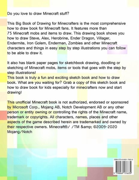 Do you want to learn how to draw your favorite Minecraft mob and item? The "Big Book of Drawing for Minecrafters" is the most comprehensive how-to-draw book for Minecraft fans. It features more than 75 different Minecraft mobs and items to draw. This drawing book shows you how to draw Steve, Alex, Herobrine, Ender Dragon, Villager, Endermite, Iron Golem, Enderman, Zombies, Sheep, Wolf, Parrot, anvil, brewing stand, and other Minecraft characters and things in easy step-by-step illustrations to follow to be able to draw it. There are plenty of characters and items one can learn how to draw. Drawing Minecraft stuff is easy with this book. It also has blank paper pages for sketchbook drawing, doodling, or sketching of Minecraft mobs, items or tools on the opposite side of the illustrations to easily follow and draw it! This book is truly a fun and exciting how-to-draw book and sketchbook. What are you waiting for? Grab a copy of this how-to-draw book and sketch book for kids especially for Minecrafters now and start drawing! This unofficial Minecraft book is not authorized, endorsed or sponsored by Microsoft Corp., Mojang AB, Notch Development AB or any other person or entity owning or controlling the rights of the Minecraft name, trademark or copyrights. All characters, names, places and other aspects of the game described herein are trademarked and owned by their respective owners. Minecraft(R)/ /TM & (c)2009-2016 Mojang/Notch