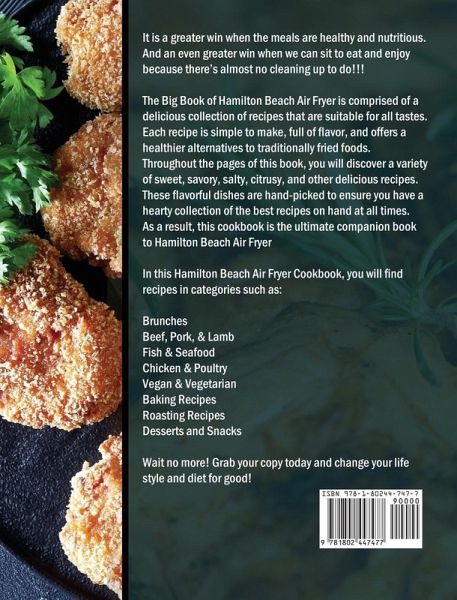 It is a greater win when the meals are healthy and nutritious. And an even greater win when we can sit to eat and enjoy because there's almost no cleaning up to do!!! The Big Book of Hamilton Beach Air Fryer is comprised of ¿ delicious collection of recipes that are suitable for all tastes. Each recipe is simple to make, full of flavor, and offers ¿ healthier alternatives to traditionally fried foods. Throughout the pages of this book, you will discover ¿ variety of sweet, savory, salty, citrusy, and other delicious recipes. These flavorful dishes are hand-picked to ensure you have ¿ hearty collection of the best recipes on hand at all times.As ¿ result, this cookbook is the ultimate companion book to Hamilton Beach Air Fryer In this Hamilton Beach Air Fryer Cookbook, you will find recipes in categories such as:Brunches Beef, Pork, & Lamb Fish & Seafood Chicken & Poultry Vegan & Vegetarian Baking Recipes Roasting Recipes Desserts and Snacks Wait no more! Grab your copy today and change your life style and diet for good!