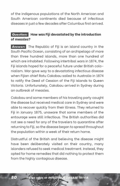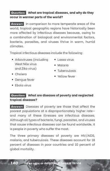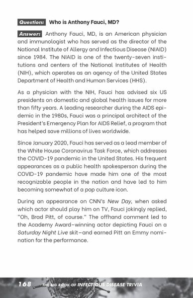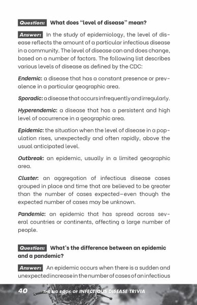 Taking a friendly approach to a serious subject, The Big Book of Infectious Disease Trivia answers all of your questions about pandemics, epidemics, and diseases-plus, it covers all of the bizarre questions you never thought to ask! From familiar diseases like influenza to ancient diseases like leprosy to oddly named diseases like mad cow disease, this trivia book tackles the mind-blowing facts and obscure details about many infectious diseases-past, present, and future. Get ready to broaden your understanding of humanity's many illnesses, from survivable to deadly, with answers to questions like: * What is the difference between an epidemic and a pandemic? * What is the oldest known infectious disease? * How is COVID-19 different from the flu and pneumonia? * Who invented the face mask? * What is herd immunity? * What does it take to have an infectious disease declared "eradicated"? * And more! With historical facts along with pop culture references, The Big Book of Infectious Disease Trivia is a must-have for anyone fascinated by infectious diseases.