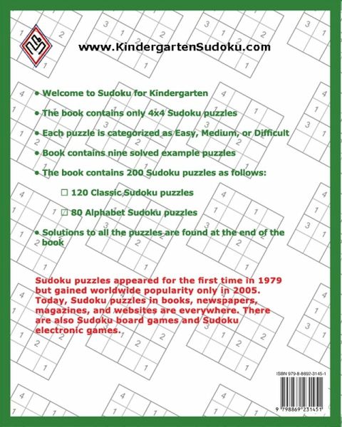This is a book containing Sudoku puzzles for children in kindergarten - ages 4 - 8 years and up. All the puzzles in the book are 4 x 4 Sudoku puzzles designed specially for these children in mind. Sudoku rules are easy - each number 1, 2, 3, and 4 must appear only once in each row, column, or block. There are 200 puzzles in the book categorized as follows: 120 Classic Sudoku (played with the four numbers 1, 2, 3, 4) and 80 Alphabet Sudoku (played with the four letter A, B, C, D). In addition, there are 9 example puzzles that are solved in a step-by-step manner. The puzzles are of three types - Easy, Medium, or Difficult. The solutions to all the puzzles in the book are available at the end of the book. The book has a website at www.PetraBooks.com where you can find more puzzle books for children. This is a companion book to the best selling book "Kindergarten Sudoku: 4x4 Sudoku Puzzles for Kids".