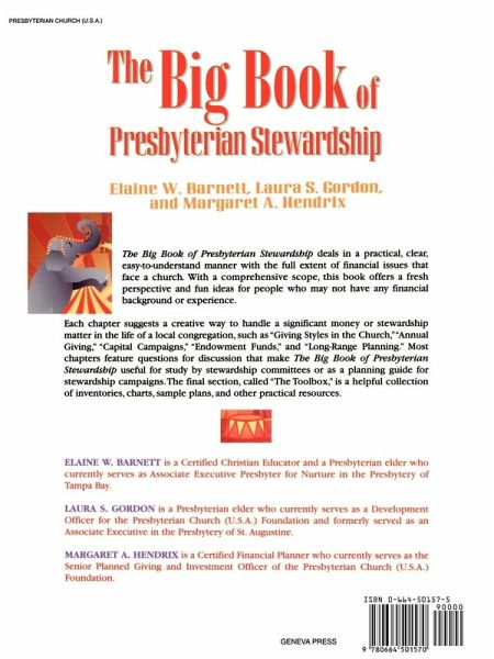 "The Big Book of Presbyterian Stewardship" deals in a practical, clear, easy-to-understand manner with the full extent of financial issues that face a church. With a comprehensive scope, this book offers a fresh perspective and fun ideas for people who may not have any financial background or experience. Most chapters feature questions for discussion that make "The Big Book of Presbyterian Stewardship" useful for study by stewardship committees or as a planning guide for stewardship campaigns. The final section includes a helpful collection of inventories, charts, sample plans, and other practical resources.