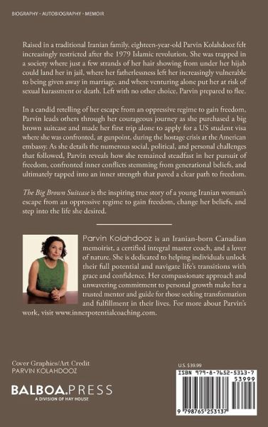 Raised in a traditional Iranian family, eighteen-year-old Parvin Kolahdooz felt increasingly restricted after the 1979 Islamic revolution. She was trapped in a society where just a few strands of her hair showing from under her hijab could land her in jail, where her fatherlessness left her increasingly vulnerable to being given away in marriage, and where venturing alone put her at risk of sexual harassment or death. Left with no other choice, Parvin prepared to flee. In a candid retelling of her escape from an oppressive regime to gain freedom, Parvin leads others through her courageous journey as she purchased a big brown suitcase and made her first trip alone to apply for a US student visa where she was confronted, at gunpoint, during the hostage crisis at the American embassy. As she details the numerous social, political, and personal challenges that followed, Parvin reveals how she remained steadfast in her pursuit of freedom, confronted inner conflicts stemming from generational beliefs, and ultimately tapped into an inner strength that paved a clear path to freedom. The Big Brown Suitcase is the inspiring true story of a young Iranian woman's escape from an oppressive regime to gain freedom, change her beliefs, and step into the life she desired.