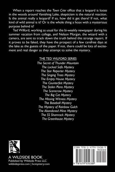 When a report reaches the Town Crier office that a leopard is loose in the woods around Vanishing Lake, skepticism is the natural reaction. Is the animal really a leopard? If so, how did it get there? If not, what kind of wild animal is it? Or is the whole thing a hoax with a mysterious purpose behind it? Ted Wilford, working as usual for the bi-weekly newspaper during his summer vacation from college, and Nelson Morgan, the wizard with a camera, are sent to track down the truth behind this strange report. If it proves to be faked, they have the prospect of a few carefree days at the lake as the guests of the paper. If not, there could be lots of excitement and real danger as they attempt to solve the mystery. This is #9 in the Ted Wilford series.