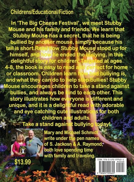In The Big Cheese Festival, we meet Stubby Mouse and his family and friends. We learn that Stubby Mouse has a secret, that he is being bullied by another mouse, simply because his tail is short. Read how Stubby Mouse stood up for himself, and how he ended the bullying, in this delightful story for children. Targeted at ages 4-8, the book is easy to read and perfect for home or classroom. Children learn how bad bullying is, and what they can do to help stop bullies! Stubby Mouse encourages children to take a stand against bullies, and always be kind to each other. This story illustrates how everyone is different and unique, and it is a delightful read with cute illustrations for both children and adults. Take a stand against bullying today!In The Big Cheese Festival, we meet Stubby Mouse and his family and friends. We learn that Stubby Mouse has a secret, that he is being bullied by another mouse, simply because his tail is short. Read how Stubby Mouse stood up for himself, and how he ended the bullying, in this delightful story for children. Targeted at ages 4-8, the book is easy to read and perfect for home or classroom. Children learn how bad bullying is, and what they can do to help stop bullies! Stubby Mouse encourages children to take aIn The Big Cheese Festival, we meet Stubby Mouse and his family and friends. We learn that Stubby Mouse has a secret, that he is being bullied by another mouse, simply because his tail is short. Read how Stubby Mouse stood up for himself, and how he ended the bullying, in this delightful story for children. Targeted at ages 4-8, the book is easy to read and perfect for home or classroom. Children learn how bad bullying is, and what they can do to help stop bullies! Stubby Mouse encourages children to take a stand against bullies, and always be kind to each other. This story illustrates how everyone is different and unique, and it is a delightful read with cute illustrations for both children and adults. Take a stand against bullying today!In The Big Cheese Festival, we meet Stubby Mouse and his family and friends. We learn that Stubby Mouse has a secret, that he is being bullied by another mouse, simply because his tail is short. Read how Stubby Mouse stood up for himself, and how he ended the bullying, in this delightful story for children. Targeted at ages 4-8, the book is easy to read and perfect for home or classroom. Children learn how bad bullying is, and what they can do to help stop bullies! Stubby Mouse encourages children to take a stand against bullies, and always be kind to each other. This story illustrates how everyone is different and unique, and it is a delightful read with cute illustrations for both children and adults. Take a stand against bullying today! stand against bullies, and always be kind to each other. This story illustrates how everyone is different and unique, and it is a delightful read with cute illustrations for both children and adults. Take a stand against bullying today!In The Big Cheese Festival, we meet Stubby Mouse and his family and friends. We learn that Stubby Mouse has a secret, that he is being bullied by another mouse, simply because his tail is short. Read how Stubby Mouse stood up for himself, and how he ended the bullying, in this delightful story for children. Targeted at ages 4-8, the book is easy to read and perfect for home or classroom. Children learn how bad bullying is, and what they can do to help stop bullies! Stubby Mouse encourages children to take a stand against bullies, and always be kind to each other. This story illustrates how everyone is different and unique, and it is a delightful read with cute illustrations for both children and adults. Take a stand against bullying today! Take a stand!! Build up your child's self-esteem! Save kids from cyber bullies! Educational read with your child, teach the difference!