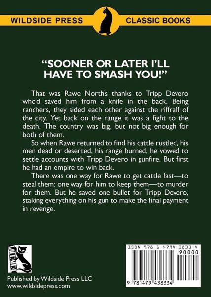 "SOONER OR LATER I'LL HAVE TO SMASH YOU!" That was Rawe North's thanks to Tripp Devero, who'd saved him from a knife in the back. Being ranchers, they sided each other against the riffraff of the city. Yet back on the range it was a fight to the death. The country was big, but not big enough for both of them. So when Rawe returned to find his cattle rustled, his men dead or deserted, his range burned, he vowed to settle accounts with Tripp Devero in gunfire. But first he had an empire to win back. There was one way for Rawe to get cattle fast -- to steal them; one way for him to keep them -- to murder for them. But he saved one bullet for Tripp Devero, staking everything on his gun to make the final payment in revenge.