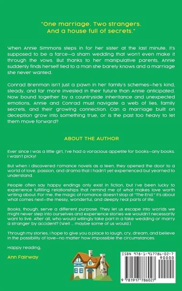 One marriage. Two strangers. And a house full of secrets. When Annie Simmons steps in for her sister at the last minute, it's supposed to be a farce-a sham wedding that won't even make it through the vows. But thanks to her manipulative parents, Annie suddenly finds herself tied to a man she barely knows and a marriage she never wanted. Conrad Brenman isn't just a pawn in her family's schemes-he's kind, steady, and far more invested in their future than Annie anticipated. Now bound together by a countryside inheritance and unexpected emotions, Annie and Conrad must navigate a web of lies, family secrets, and their growing connection. Can a marriage built on deception grow into something true, or is the past too heavy to let them move forward?