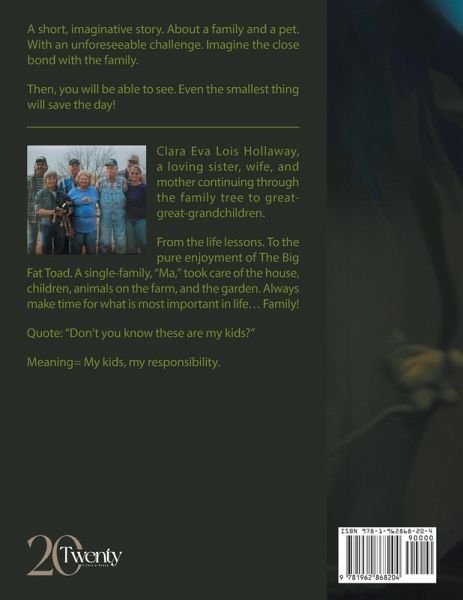 A short, imaginative story. About a family and a pet. With an unforeseeable challenge. Imagine the close bond with the family. Then, you will be able to see. Even the smallest thing will save the day! Clara Eva Lois Hollaway, a loving sister, wife, and mother continuing through the family tree to great-great-grandchildren. From the life lessons. To the pure enjoyment of The Big Fat Toad. A single-family, "Ma," took care of the house, children, animals on the farm, and the garden. Always make time for what is most important in life... Family! Quote: "Don't you know these are my kids?" Meaning= My kids, my responsibility.