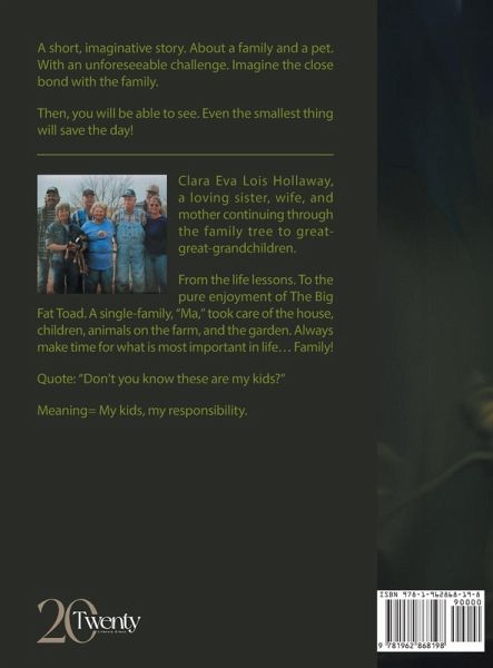 A short, imaginative story. About a family and a pet. With an unforeseeable challenge. Imagine the close bond with the family. Then, you will be able to see. Even the smallest thing will save the day! Clara Eva Lois Hollaway, a loving sister, wife, and mother continuing through the family tree to great-great-grandchildren. From the life lessons. To the pure enjoyment of The Big Fat Toad. A single-family, "Ma," took care of the house, children, animals on the farm, and the garden. Always make time for what is most important in life... Family! Quote: "Don't you know these are my kids?" Meaning= My kids, my responsibility.