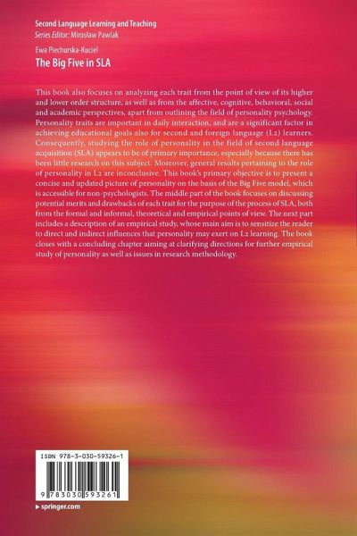 This book also focuses on analyzing each trait from the point of view of its higher and lower order structure, as well as from the affective, cognitive, behavioral, social and academic perspectives, apart from outlining the field of personality psychology. Personality traits are important in daily interaction, and are a significant factor in achieving educational goals also for second and foreign language (L2) learners. Consequently, studying the role of personality in the field of second language acquisition (SLA) appears to be of primary importance, especially because there has been little research on this subject. Moreover, general results pertaining to the role of personality in L2 are inconclusive. This book's primary objective is to present a concise and updated picture of personality on the basis of the Big Five model, which is accessible for non-psychologists. The middle part of the book focuses on discussing potential merits and drawbacks of each trait for the purpose ofthe process of SLA, both from the formal and informal, theoretical and empirical points of view. The next part includes a description of an empirical study, whose main aim is to sensitize the reader to direct and indirect influences that personality may exert on L2 learning. The book closes with a concluding chapter aiming at clarifying directions for further empirical study of personality as well as issues in research methodology.
