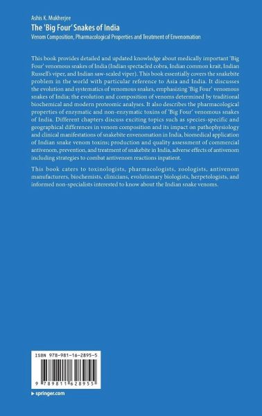 Chapter 1. Introduction: The snakebite problem.- Chapter 2. Evolution of snakes and systematics of Big Four venomous snakes of India.- Chapter 3. Snake venom: Composition, evolution, function, and biomedical applications.- Chapter 4. Indian spectacled cobra (Naja naja).- Chapter 5. Indian common Krait (Bungarus cerelus).- Chapter 6. Indian Russell's viper (Daboia russelii).- Chapter 7. Indian Saw-scaled viper (Echis carinatus).- Chapter 8. Prevention and Treatment of Big Four Snakebite in India.