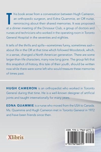 This book arose from a conversation between Hugh Cameron, an orthopedic surgeon, and Edna Quammie, an OR nurse, reminiscing about their shared memories. It was proposed at a dinner meeting of the Dinosaur Club, a group of doctors and nurses and technicians who worked in the operating room in Toronto General Hospital in the seventies and eighties. It tells of the thrills and spills-sometimes funny, sometimes sad-about life in the OR at that time which followed Woodstock, which, in a sense, changed a North American generation. There are some larger-than-life characters, many now long gone. The group felt that this snapshot of history, this tale of their youth, should be written now while there were some left who would treasure these memories of times past.