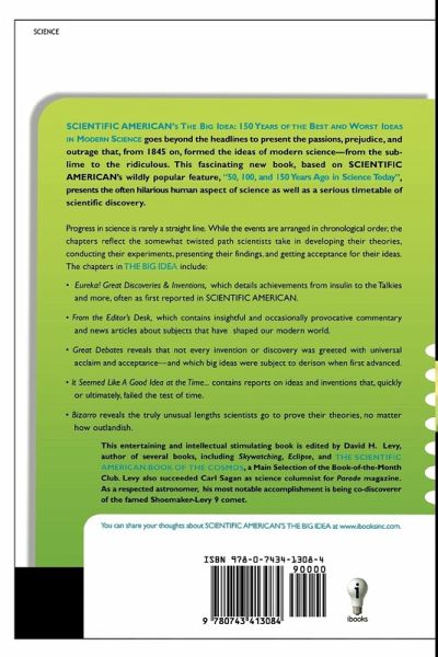 SCIENTIFIC AMERICAN's The Big Idea: 150 Years of the Best and Worst Ideas in Modern Science goes beyond the headlines to present the passions, prejudice, and outrage that, from 1845 on, formed the ideas of modern science -- from the sublime to the ridiculous. This fascinating new book, based on SCIENTIFIC AMERICAN's wildly popular feature, "50, 100, and 150 Years Ago in Science Today", presents the often hilarious human aspect of science as well as a serious timetable of scientific discovery. Progress in science is rarely a straight line. While the events are arranged in chronological order, the chapters reflect the somewhat twisted path scientists take in developing their theories, conducting their experiments, presenting their findings, and getting acceptance for their ideas. The chapters in THE BIG IDEA include: Eureka! Great Discoveries & Inventions, which details achievements from insulin to the Talkies and more, often as first reported in SCIENTIFIC AMERICAN. From the Editor's Desk, which contains insightful and occasionally provocative commentary and news articles about subjects that have shaped our modern world. Great Debates reveals that not every invention or discovery was greeted with universal acclaim and acceptance -- and which big ideas were subject to derison when first advanced. It Seemed Like A Good Idea at the Time...contains reports on ideas and inventions that, quickly or ultimately, failed the test of time. Bizarro reveals the truly unusual lengths scientists go to prove their theories, no matter how outlandish.