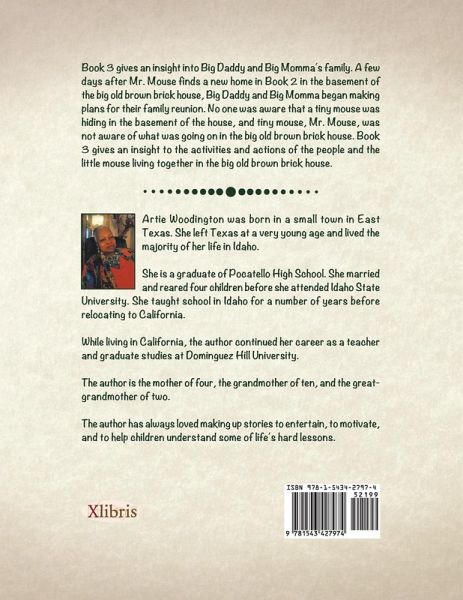 Book 3 gives an insight into Big Daddy and Big Momma’s family. A few days after Mr. Mouse finds a new home in Book 2 in the basement of the big old brown brick house, Big Daddy and Big Momma began making plans for their family reunion. No one was aware that a tiny mouse was hiding in the basement of the house, and tiny mouse, Mr. Mouse, was not aware of what was going on in the big old brown brick house. Book 3 gives an insight to the activities and actions of the people and the little mouse living together in the big old brown brick house.