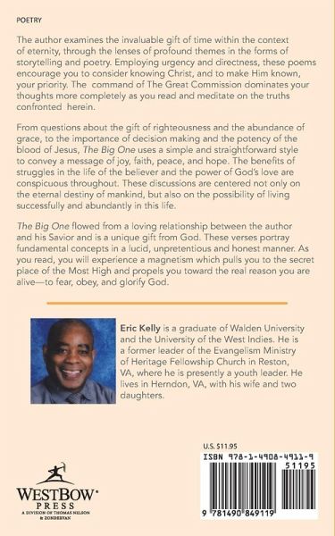 The author examines the invaluable gift of time within the context of eternity, through the lenses of profound themes in the forms of storytelling and poetry. Employing urgency and directness, these poems encourage you to consider knowing Christ, and to make Him known, your priority. The command of The Great Commission dominates your thoughts more completely as you read and meditate on the truths confronted herein. From questions about the gift of righteousness and the abundance of grace, to the importance of decision making and the potency of the blood of Jesus, The Big One uses a simple and straightforward style to convey a message of joy, faith, peace, and hope. The benefits of struggles in the life of the believer and the power of God's love are conspicuous throughout. These discussions are centered not only on the eternal destiny of mankind, but also on the possibility of living successfully and abundantly in this life. The Big One flowed from a loving relationship between the author and his Savior and is a unique gift from God. These verses portray fundamental concepts in a lucid, unpretentious and honest manner. As you read, you will experience a magnetism which pulls you to the secret place of the Most High and propels you toward the real reason you are alive-to fear, obey, and glorify God.
