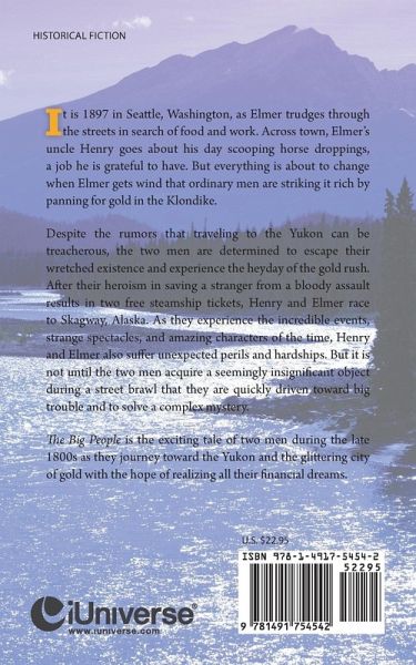 It is 1897 in Seattle, Washington, as Elmer trudges through the streets in search of food and work. Across town, Elmer's uncle Henry goes about his day scooping horse droppings, a job he is grateful to have. But everything is about to change when Elmer gets wind that ordinary men are striking it rich by panning for gold in the Klondike. Despite the rumors that traveling to the Yukon can be treacherous, the two men are determined to escape their wretched existence and experience the heyday of the gold rush. After their heroism in saving a stranger from a bloody assault results in two free steamship tickets, Henry and Elmer race to Skagway, Alaska. As they experience the incredible events, strange spectacles, and amazing characters of the time, Henry and Elmer also suffer unexpected perils and hardships. But it is not until the two men acquire a seemingly insignificant object during a street brawl that they are quickly driven toward big trouble and to solve a complex mystery. The Big People is the exciting tale of two men during the late 1800s as they journey toward the Yukon and the glittering city of gold with the hope of realizing all their financial dreams.