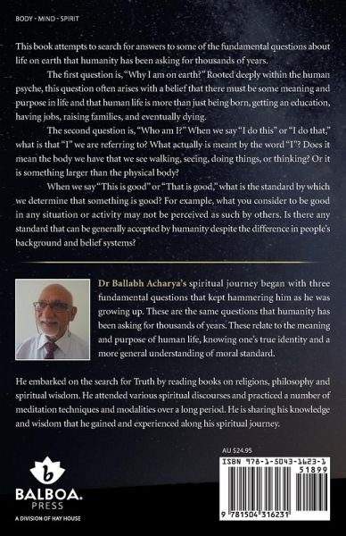 This book attempts to search for answers to some of the fundamental questions about life on earth that humanity has been asking for thousands of years. The first question is, "Why I am on earth?" Rooted deeply within the human psyche, this question often arises with a belief that there must be some meaning and purpose in life and that human life is more than just being born, getting an education, having jobs, raising families, and eventually dying. The second question is, "Who am I?" When we say "I do this" or "I do that," what is that "I" we are referring to? What actually is meant by the word "I"? Does it mean the body we have that we see walking, seeing, doing things, or thinking? Or it is something larger than the physical body? When we say "This is good" or "That is good," what is the standard by which we determine that something is good? For example, what you consider to be good in any situation or activity may not be perceived as such by others. Is there any standard that can be generally accepted by humanity despite the difference in people's background and belief systems?