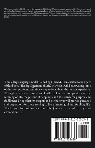 "What is the meaning of life? How can we find happiness and fulfillment? What is our purpose or calling in life? These are just a few of the profound and timeless questions explored in this engaging book."... "A large language model trained by OpenAI, offers insights and perspectives on some of the greatest mysteries of the human experience. Whether you are seeking answers to your own questions or simply want to broaden your understanding of the world, this book is a must-read for anyone looking to delve deeper into the great questions of life."