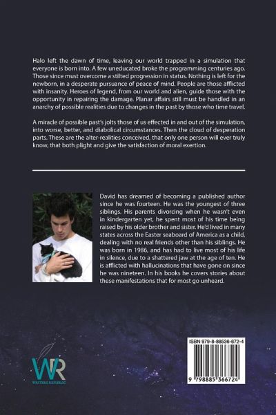 Halo left the dawn of time, leaving our world trapped in a simulation that everyone is born into. A few uneducated broke the programming centuries ago. Those since must overcome a stilted progression in status. Nothing is left for the newborn, in a desperate pursuance of peace of mind. People are those afflicted with insanity. Heroes of legend, from our world and alien, guide those with the opportunity in repairing the damage. Planar ä airs still must be handled in an anarchy of possible realities due to changes in the past by those who time travel. A miracle of possible past's jolts those of us effected in and out of the simulation, into worse, better, and diabolical circumstances. Then the cloud of desperation parts. These are the alter-realities conceived, that only one person will ever truly know, that both plight and give the satisfaction of moral exertion.