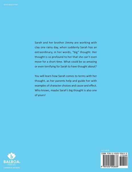 Sarah and her brother Jimmy are working with clay one rainy day, when suddenly Sarah has an extraordinary, in her words, "big" thought. Her thought is so profound to her that she can't even move for a short time. What could be so amazing or even terrifying for Sarah to have thought about? You will learn how Sarah comes to terms with her thought, as her parents help and guide her with examples of character choices and cause and effect. Who knows, maybe Sarah's big thought is also one of yours!