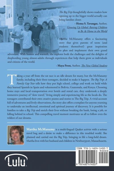 Taking a year off from the rat race is an idle dream for many, but the McManamy family, including their three teenagers, decided to make it happen. The Big Trip: A Family Gap Year tells how they put high school, college and work on hold while they learned Spanish in Spain and volunteered in Bolivia, Guatemala, and Kenya. Choosing home stays and local transportation over hotels and rental cars, they undertook a deeply immersive journey of "slow travel," living simply and experiencing life as the locals do. The teenagers contributed their own creative poems and stories to The Big Trip. A vivid account full of adventures and lively observations, the story also offers a template for anyone yearning to undertake an intellectual, emotional and spiritual journey of discovery. It is possible for families to take a Big Trip and enrich their lives without breaking the bank, losing a job, or falling behind in school. This compelling travel memoir motivates us all to follow even the wildest of our dreams.