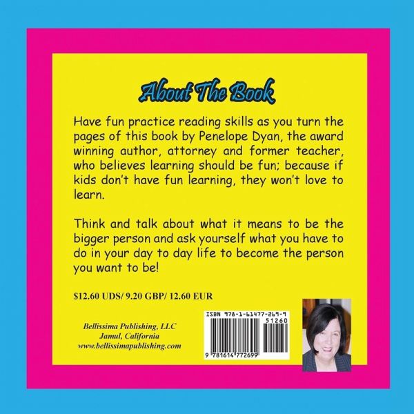 Knowing what is right and what is wrong is fundamental to becoming and then being the bigger person. And as you will discover, being the bigger person has nothing at all to do with size. Use this learn to read book written and illustrated by the award winning author, attorney and former K-3 teacher, Penelope Dyan, to practice your reading skills through word recognition and through word repetition and rhyme, and then think about and discuss what it means to truly be the bigger person. Enjoy some familiar Dyan characters as you turn the pages of this kid-sized book with its extra large print that is perfect for little eyes; but most of all, have fun with this 'learn to read' book, because if a kid doesn't have fun learning, a kid won't love to learn. Then, when you are all finished reading, you can go to the Bellissimavideo YouTube channel and watch the free music video that goes along with this book, and have even more learning fun!