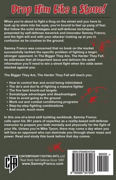 Learn How to Beat a Bigger and Stronger Opponent When you're about to fight a thug on the street and you have to look up to stare into his eyes, you're bound to feel up pang of fear. But follow the solid strategies and self-defense techniques presented by self-defense maverick and innovator Sammy Franco, and the fight will end with your attacker looking up at you in confusion as he crashes to the ground. Sammy Franco was concerned that no book on the market successfully tackled the specific problem of fighting a larger, stronger opponent. In The Bigger They Are, The Harder They Fall, he addresses that all-important issue and delivers the solid information you'll need to win a street fight when the odds seem stacked against you. The Bigger They Are, The Harder They Fall will teach you: * How to avoid panic and intimidation * The do's and don'ts of fighting a massive fighter * The five best knock-out targets * What works, what doesn't, and why * How to avoid the ground fight * Workout routines * Equipment training * Step-by-step fighting combinations * And much, much more. In this one-of-a-kind skill building workbook, Sammy Franco calls upon his 30+ years of experience as a reality-based self-defense expert to prepare you both mentally and physically for the fight of your life. Unless you're a lineman for the NFL, there may come a day when you will face an opponent who can dominate you through sheer mass and power. Read and study this book before that day comes.