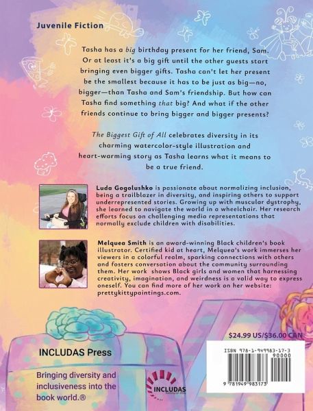 Tasha has a big birthday present for her friend, Sam. Or at least it's a big gift until the other guests start bringing even bigger ones. Tasha can't let her present be the smallest because it has to be just as big-no, bigger-than Tasha and Sam's friendship. But how can Tasha find something that big? And what if the other friends continue to bring bigger and bigger presents? The Biggest Gift of All celebrates diversity in its charming watercolor-style illustration and heart-warming story as Tasha learns what it means to be a true friend.