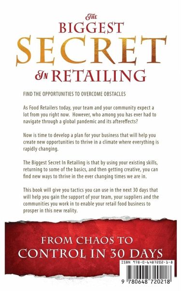 FIND THE OPPORTUNITIES TO OVERCOME OBSTACLES As Food Retailers today, your team and your community expect a lot from you right now. However, who among you has ever had to navigate through a global pandemic and its aftereffects? Now is time to develop a plan for your business that will help you create new opportunities to thrive in a climate where everything is rapidly changing. The Biggest Secret In Retailing is that by using your existing skills, returning to some of the basics, and then getting creative, you can find new ways to thrive in the ever changing times we are in. This book will give you tactics you can use in the next 30 days that will help you gain the support of your team, your suppliers and the communities you work in to enable your retail food business to prosper in this new reality.