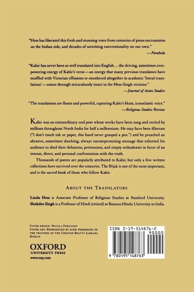 Kabir was an extraodinary oral poet whose works have been sung and recited by millions throughout North India for half a millennium. He may have been illiterate: "I do not touch ink or paper, this hand has never grasped a pen" and he preached an abrasive, sometimes shocking, always uncompromising message that exhorted his audience to shed their delusions, pretensions, and empty orthodoxies in favour of an intense, direct, and personal confrontation with the truth. Thousands of poems are popularly attributed to Kabir, but only a few written collections have survived over the centuries. The "Bijak" is one of the most important, and is the sacred book of those who follow Kabir.