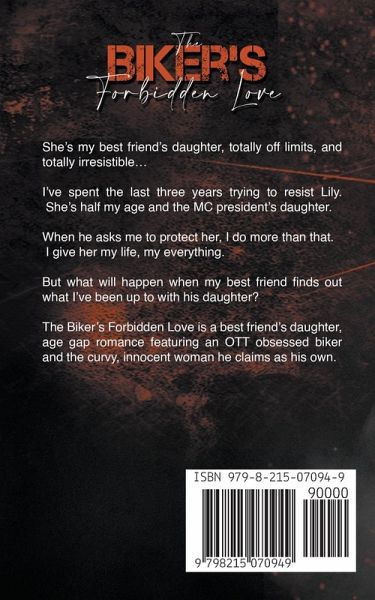 She's my best friend's daughter, totally off-limits, and totally irresistible... I've spent the last three years trying to resist Lily. She's half my age and the MC president's daughter. When he asks me to protect her, I do more than that. I give her my life, my everything. But what will happen when my best friend finds out what I've been up to with his daughter? The Biker's Forbidden Love is a best friend's daughter, age gap romance featuring an OTT obsessed biker and the curvy, innocent woman he claims as his own. Authors note: The Biker's Forbidden Love is a steamy instalove novella that can be read in about two hours. If you love a quickie, then dive on in! Approx word count: 14k