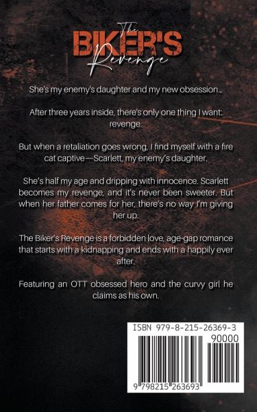 She's my enemy's daughter and my new obsession... After three years inside, there's only one thing I want: revenge. But when a retaliation goes wrong, I find myself with a fire cat captive-Scarlett, my enemy's daughter. She's half my age and dripping with innocence. Scarlett becomes my revenge, and it's never been sweeter. But when her father comes for her, there's no way I'm giving her up. The Biker's Revenge is a forbidden love, age-gap romance that starts with a kidnapping and ends with a happily ever after. Featuring an OTT obsessed hero and the curvy girl he claims as his own. Authors note: The Biker's Revenge is a steamy instalove novella that can be read in about two hours. If you love a quickie, then dive on in! Approx. 14k words
