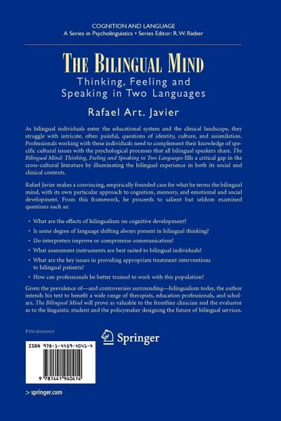 Rafael Javier makes a convincing, empirically founded case for what he terms the bilingual mind, with its own particular approach to cognition, memory, and emotional and social development. From this framework, he proceeds to salient but seldom examined questions such as: What are the effects of bilingualism on cognitive development? Is some degree of language shifting always present in bilingual thinking? Do interpretersimprove or compromise communication? What assessment instruments are best suited to bilingual individuals? What are the key issues in providing appropriate treatment interventions to bilingual patients? How can professionals be better trained to work with this population?
