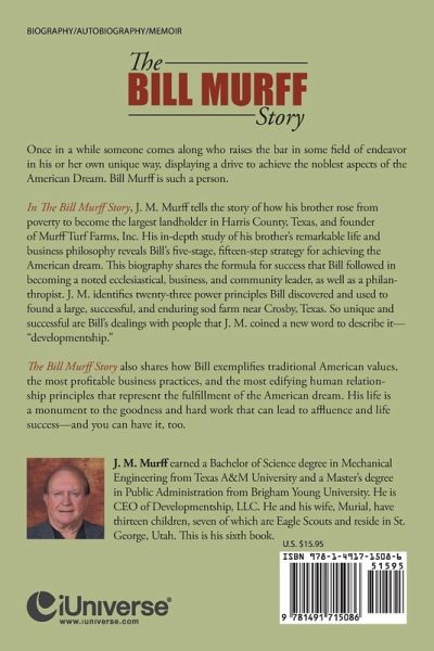 Once in a while someone comes along who raises the bar in some field of endeavor in his or her own unique way, displaying a drive to achieve the noblest aspects of the American Dream. Bill Murff is such a person. In The Bill Murff Story, J. M. Murff tells the story of how his brother rose from poverty to become the largest landholder in Harris County, Texas, and founder of Murff Turf Farms, Inc. His in-depth study of his brother's remarkable life and business philosophy reveals Bill's five-stage, fifteen-step strategy for achieving the American dream. This biography shares the formula for success that Bill followed in becoming a noted ecclesiastical, business, and community leader, as well as a philanthropist. J. M. identifies twenty-three power principles Bill discovered and used to found a large, successful, and enduring sod farm near Crosby, Texas. So unique and successful are Bill's dealings with people that J. M. coined a new word to describe it-"developmentship." The Bill Murff Story also shares how Bill exemplifies traditional American values, the most profitable business practices, and the most edifying human relationship principles that represent the fulfillment of the American dream. His life is a monument to the goodness and hard work that can lead to affluence and life success-and you can have it, too.