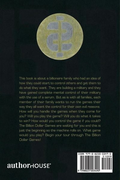 This book is about a billionaire family who had an idea of how they could start to control others and get them to do what they want. They are building a military and they have gained complete mental control of their military with the use of a serum. But as is with all families, each member of their family wants to run the games their way they all want the control for their own evil reasons. How will you handle the games when they come for you? Will you play the game? Will you do what it takes to win? How would you control the game if you could? The Billion Dollar Games are waiting for you and this is just the beginning so the machine rolls on. What game would you play? Begin your tour through The Billion Dollar Games!
