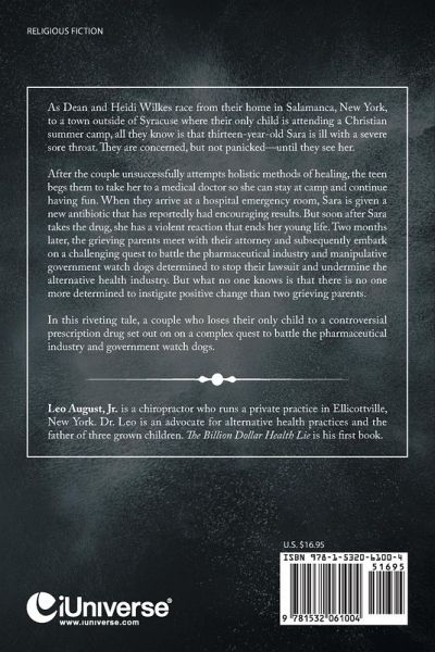 As Dean and Heidi Wilkes race from their home in Salamanca, New York, to a town outside of Syracuse where their only child is attending a Christian summer camp, all they know is that thirteen-year-old Sara is ill with a severe sore throat. They are concerned, but not panicked-until they see her. After the couple unsuccessfully attempts holistic methods of healing, the teen begs them to take her to a medical doctor so she can stay at camp and continue having fun. When they arrive at a hospital emergency room, Sara is given a new antibiotic that has reportedly had encouraging results. But soon after Sara takes the drug, she has a violent reaction that ends her young life. Two months later, the grieving parents meet with their attorney and subsequently embark on a challenging quest to battle the pharmaceutical industry and manipulative government watch dogs determined to stop their lawsuit and undermine the alternative health industry. But what no one knows is that there is no one more determined to instigate positive change than two grieving parents. In this riveting tale, a couple who loses their only child to a controversial prescription drug set out on on a complex quest to battle the pharmaceutical industry and government watch dogs.
