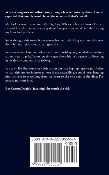 When a gorgeous smooth-talking stranger breezed into my diner, I never expected that trouble would be on the menu- and that's not all... My hackles rose the minute Mr. Big City Wheeler-Dealer Carson Daniels stepped into the restaurant raving about "untapped potential" and threatening my fierce independence. Soon though, this suave businessman has me rethinking not just slick new decor but my rigid views on dating outsiders. Yet even as our plans intertwine toward re-launching my granddad's eatery into a trendy gastro pub,Carson remains cagey about his own agenda for lingering in my sleepy community for so long. In a town like Branson, every little action can have big rippling effects. If I dare to trust this mystery investor as more than a casual fling, it could mean handing him the keys to everything from my heart to the very soul of the diner I've poured my heart into. But Carson Daniels, just might be worth the risk. Author's Note: The Billionaire Branson Brothers: Carson is a standalone book in The Billionaire Branson Brothers Collection. The Collection features the Whitmore brothers of Branson, Missouri as they try to change their ways and find true love. The books can be read in any order and have reoccuring characters, small town drama, slow burn, and HEAs.