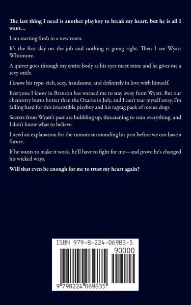 The last thing I need is another playboy to break my heart, but he is all I want... I am starting fresh in a new town. It's the first day on the job and nothing is going right. Then I see Wyatt Whitmore. A quiver goes through my entire body as his eyes meet mine and he gives me a sexy smile. I know his type- rich, sexy, handsome, and definitely in love with himself. Everyone I know in Branson has warned me to stay away from Wyatt. But our chemistry burns hotter than the Ozarks in July, and I can't tear myself away. I'm falling hard for this irresistible playboy and his ragtag pack of rescue dogs. Secrets from Wyatt's past are bubbling up, threatening to ruin everything, and I don't know what to believe. I need an explanation for the rumors surrounding his past before we can have a future. If he wants to make it work, he'll have to fight for me-and prove he's changed his wicked ways. Will that even be enough for me to trust my heart again? Author's Note: This is a standalone romance book that is part of The Billionaire Branson Brothers Collection. These books follow the Whitmore brothers of Branson, Missouri as they try to change their ways and find love in the midwest town. The books can be read in any order and feature relatable characters, slow burn romance and HEAs.