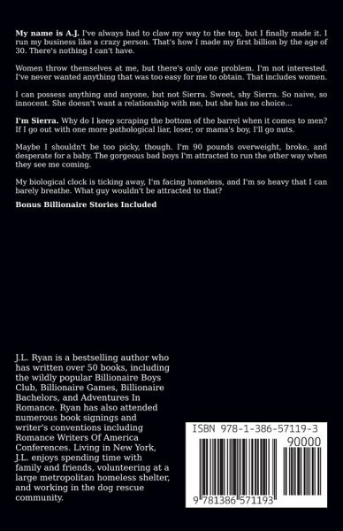My name is A.J. I've always had to claw my way to the top, but I finally made it. I run my business like a crazy person. That's how I made my first billion by the age of 30. There's nothing I can't have. Women throw themselves at me, but there's only one problem. I'm not interested. I've never wanted anything that was too easy for me to obtain. That includes women. I can possess anything and anyone, but not Sierra. Sweet, shy Sierra. So naive, so innocent. She doesn't want a relationship with me, but she has no choice... I'm Sierra. Why do I keep scraping the bottom of the barrel when it comes to men? If I go out with one more pathological liar, loser, or mama's boy, I'll go nuts. Maybe I shouldn't be too picky, though. I'm 90 pounds overweight, broke, and desperate for a baby. The gorgeous bad boys I'm attracted to run the other way when they see me coming. My biological clock is ticking away, I'm facing homeless, and I'm so heavy that I can barely breathe. What guy wouldn't be attracted to that? Books Included In This Boxed Set The Billionaire's Game The Billionaire's Gift The Billionaire's Caregiver The Billionaire's Romance Buy Now!