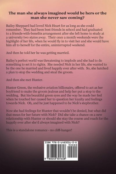 Bailey Sheppard had loved Nick Heart for as long as she could remember. They had been best friends in school and had graduated to a friends-with-benefits arrangement after she left home to study at a university two states away. Their once a month weekends were the highlight of her life, when he would fly in to visit her and she would have him all to herself for the entire, uninterrupted weekend. And then he told her he was getting married. Bailey’s perfect world was threatening to implode and she had to do something to set it to rights. She needed Nick in her life, she wanted to be the one he married and lived happily ever after with. So, she hatched a plan to stop the wedding and steal the groom. And then she met Hunter. Hunter Green, the reclusive aviation billionaire, offered to act as her boyfriend to make the groom jealous and help her put a stop to the wedding. But his beautiful green eyes and the way he made her feel when he touched her cause her to question her loyalty and feelings towards Nick. Oh, and he just happens to be Nick’s stepbrother. Now she had feelings for Hunter that won’t be denied, but what did that mean for her future with Nick? Did she take a chance on a new relationship with Hunter or should she stay the course and reach for the happily ever after she’d always imagined with Nick? This is a standalone romance - no cliff-hanger! *This is a ‘Too Hot to Handle’ romance on the Emma Lea rating scale - These are definitely 18+ reads and contain graphic sex scenes and high level swearing – not for the faint of heart.