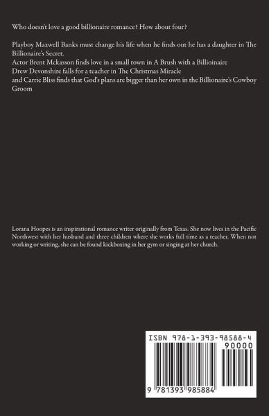 Who doesn't love a good billionaire romance? How about three? Playboy Maxwell Banks must change his life when he finds out he has a daughter in The Billionaire's Secret. Drew Devonshire falls for a teacher in The Christmas Miracle and Carrie Bliss finds that God's plans are bigger than her own in the Billionaire's Cowboy Groom Fans of Susan May Warren, Melissa McClone, and Dale Mayer will love these inspirational romances. Join best selling author Lorana Hoopes as she weaves God's love through stories of second chances and redemption!