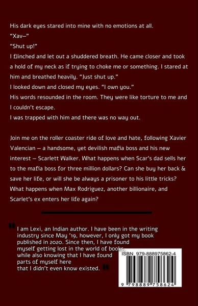 His dark eyes stared into mine with no emotions at all. "Xav-" "Shut up!" I flinched and let out a shuddered breath. He came closer and took a hold of my neck as if trying to choke me or something. I stared at him and breathed heavily. "Just shut up." I looked down and closed my eyes. "I own you." His words resounded in the room. They were like torture to me and I couldn't escape. I was trapped with him and there was no way out. ______________________ Join me on the roller coaster ride of love and hate, following Xavier Valencian - a handsome, yet devilish mafia boss and his new interest - Scarlett Walker. What happens when Scar's dad sells her to the mafia boss for three million dollars? Can she buy her back & save her life, or will she be always a prisoner to his little tricks? What happens when Max Rodriguez, another billionaire, and Scarlet's ex enters her life again?