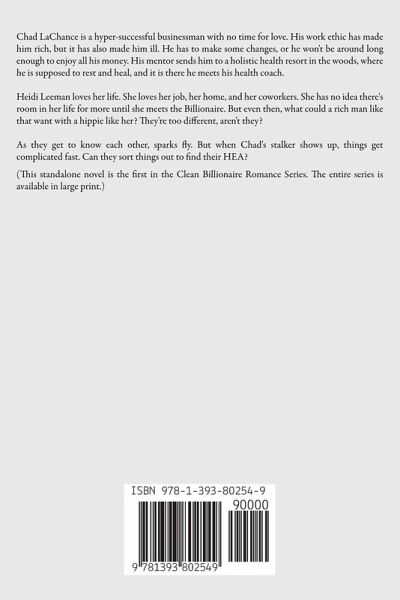 Chad LaChance is a hyper-successful businessman with no time for love. His work ethic has made him rich, but it has also made him ill. He has to make some changes, or he won't be around long enough to enjoy all his money. His mentor sends him to a holistic health resort in the woods, where he is supposed to rest and heal, and it is there he meets his health coach. Heidi Leeman loves her life. She loves her job, her home, and her coworkers. She has no idea there's room in her life for more until she meets the Billionaire. But even then, what could a rich man like that want with a hippie like her? They're too different, aren't they? As they get to know each other, sparks fly. But when Chad's stalker shows up, things get complicated fast. Can they sort things out to find their HEA? (This standalone novel is the first in the Clean Billionaire Romance Series. The entire series is available in large print.)