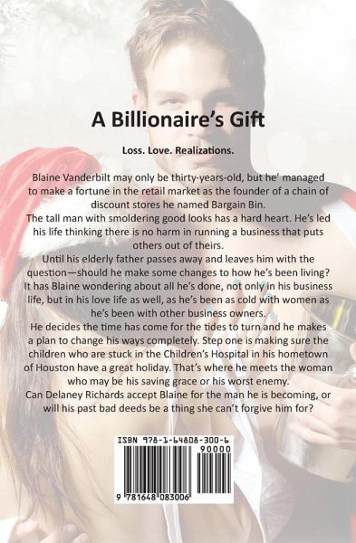 The Billionaire's Gift: A Holiday Romance Blaine Vanderbilt has smoldering good looks and a good heart to go along with that. He's planning on playing Santa to a bunch of sick children who are in the hospital dealing with illnesses during the holidays in his hometown of Houston, Texas. He's spent his thirty-six years doing not so good deeds as he made his fortune by founding a retail chain called Bargain Bin, Inc. A company that moves into small towns and offers all the things the non-chain stores offer at dirt-cheap prices as they get all of their stock from other countries at cut-rate…mehr