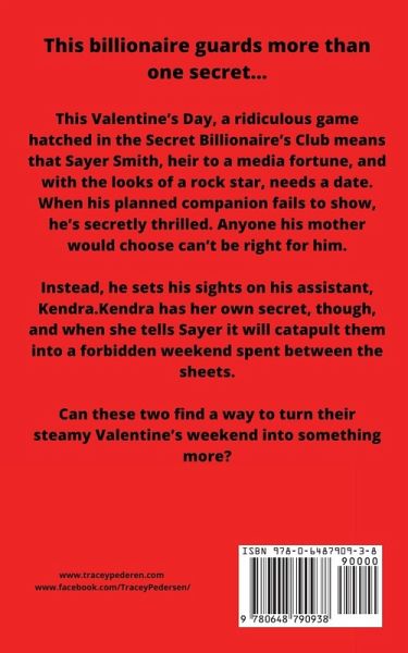 This billionaire guards more than one secret… This Valentine's Day, a ridiculous game hatched in the Secret Billionaire's Club means that Sayer Smith, heir to a media fortune, and with the looks of a rock star, needs a date. When his planned companion fails to show, he's secretly thrilled. Anyone his mother would choose can't be right for him. Instead, he sets his sights on his assistant, Kendra. Kendra has her own secret, though, and when she tells Sayer it will catapult them into a forbidden weekend spent between the sheets. Can these two find a way to turn their steamy Valentine's weekend into something more?